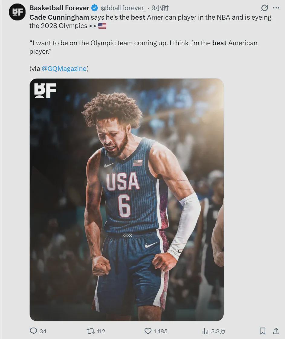 最新一期的NBA官方MVP排行榜,坎寧安依然位列第四,聯盟前三分別是:亞歷山大、東契奇和約基奇。近日坎寧安接受媒體采訪時說道:“我想代表美國男籃出戰2028年洛杉磯奧運會,我覺得自己是NBA聯盟最好的美國球員!”