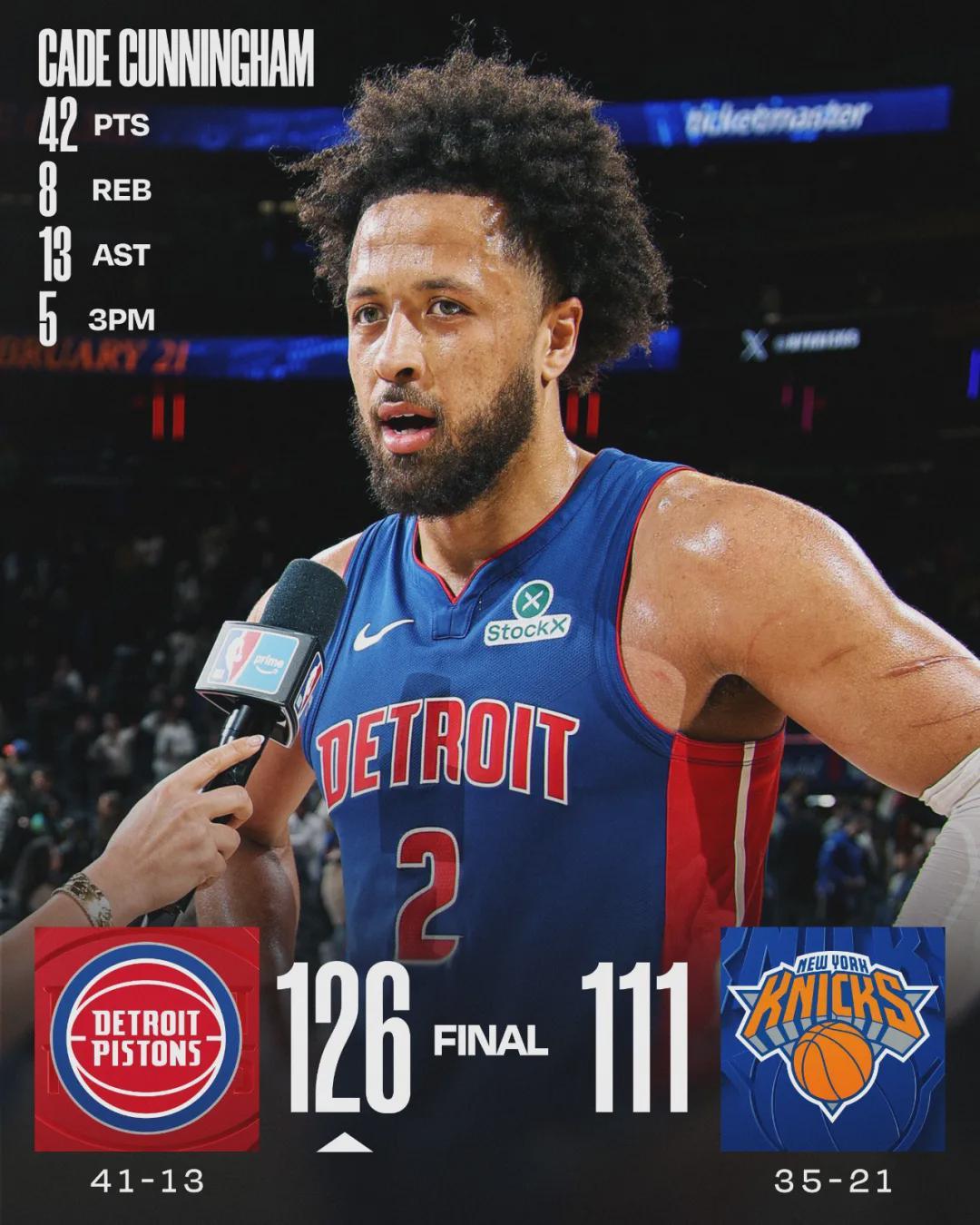 活塞狀元坎寧安今天開啟暴走模式:首發出戰38分鐘,34投17中,三分11中5,罰球3中3,狂轟42分8籃板13助攻1搶斷2蓋帽。他成為NBA歷史上第三個在麥迪遜廣場花園轟下40分+10助攻的客隊球員,前兩個是艾弗森和詹姆斯。