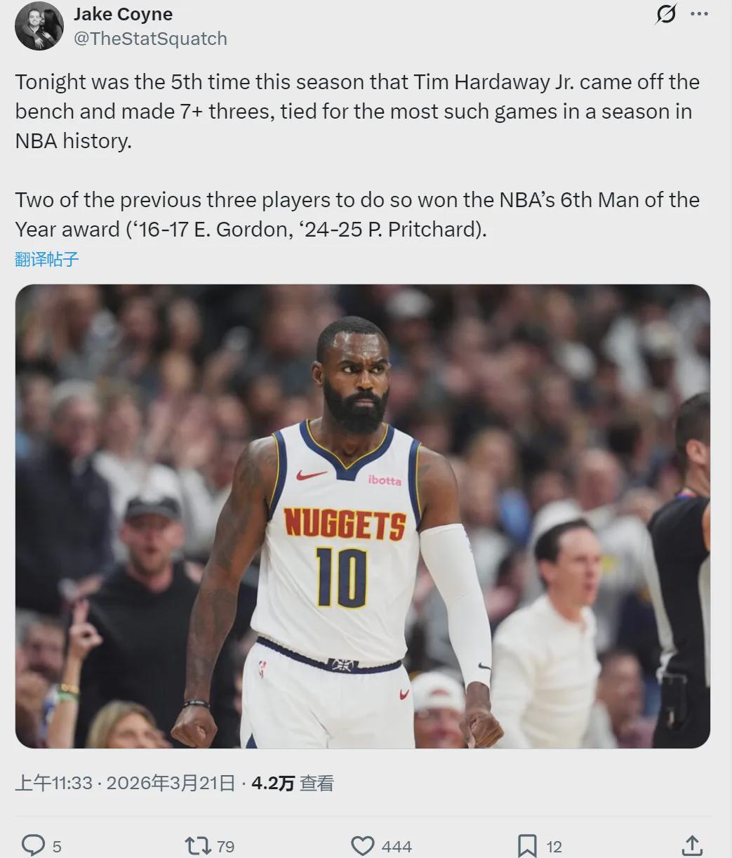 這是小哈達(dá)威本賽季第5次替補(bǔ)出戰(zhàn)投進(jìn)7+三分,追平了NBA歷史紀(jì)錄。這一紀(jì)錄由三名球員共同保持:2016-17賽季的埃里克-戈登、2024-25賽季的普里查德和馬利克-比斯利。常規(guī)賽還剩11場(chǎng),小哈達(dá)威很有機(jī)會(huì)打破歷史紀(jì)錄。